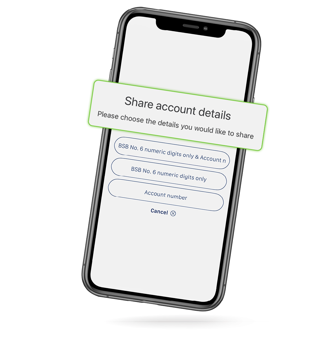 Share your BSB and Account number with contacts in your phone through the Share function for quick and easy receipt of payments.